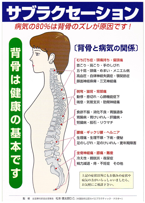 サブラクセーション図は、(一般社団法人)全国療術師協会 理事長 松本徳太郎D.C.監修の院内用ポスターです。